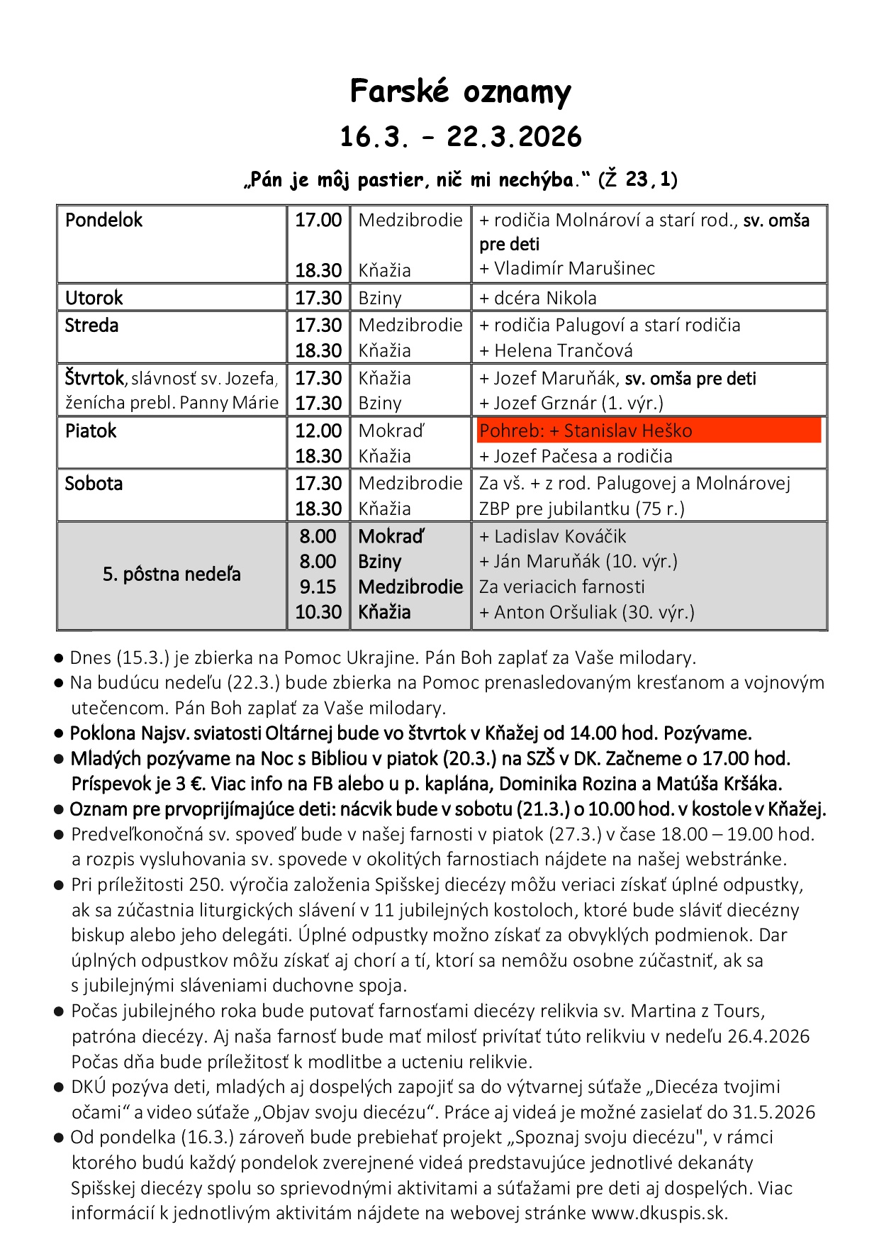 PREDVEĽKONOČNÁ SPOVEĎ V DOLNOKUBÍNSKOM DEKANÁTE 2026